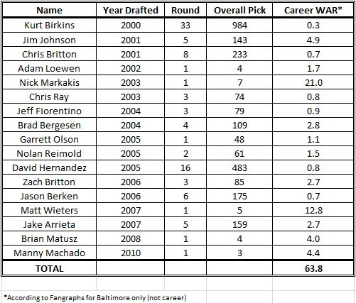 The WAR in the table only includes players who contributed a positive WAR. Draftees producing a negative WAR for the Orioles were not included (for example, Xavier Avery contributed -0.2 WAR last year), so the cumulative WAR the Orioles received from their draft picks since 2000 is going to be lower than 63.8. I have not looked at the wins above replacement accumulated by other teams from the draft during the same period, but 63.8 seems really low and I’d be shocked if it didn’t rank towards the bottom of the league. Some points of observation before we wrap this up.