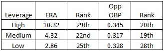 Unlike hitters, where OBP generally encompasses a batter’s ability to keep the inning rolling and scoring runs, I had a hard time finding one stat that would be the equivalent for a pitcher. Inherent in all pitching statistics is the variability element of the fielding behind the pitcher. With a poor fielding team behind him, the pitcher might react more stressed than if he knows he can trust his defense to make the plays. This led me to having difficulty in selecting which statistic to compare the pitchers in high, medium, and low leverage situations. Ultimately, I had to decide on reviewing multiple factors depending on the type of pitcher (starter vs. reliever). For starters I looked at ERA, while for relievers I also factored in the percent of inherited runners that scored, since part of the relievers role is to bailout the starter and finish the inning without allowing any runs.