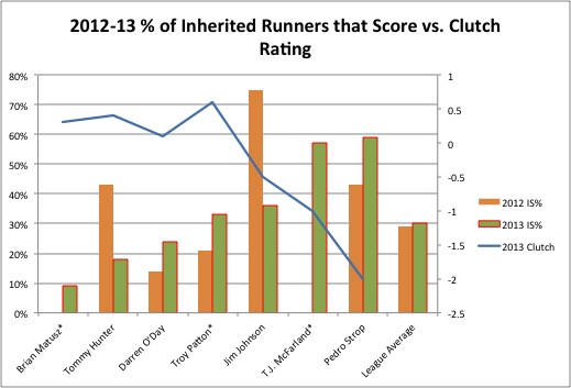 Inherited runners scored against appears to be a direct indicator of clutch level. As the percent of runners allowed to score went up the clutch rating went down. The percent of inherited runners scored combined with the leverage ERA gives a better indication of when to bring in a reliever. Brian Matusz rarely lets inherited runners score but has trouble when an inning has the most pressure. Therefore, its best to use him in middle inning situations where there pressure isn’t too high but you need to get a guy out as the starter is struggling. Johnson has improved on inherited runners this year but he is still best used to start the ninth inning to capitalize on his hidden strengths of performing better without men on base and lower leverage situations. If Johnson were not able to pitch for a save situation or the team desperately needed a guy to come in and shut down the other team’s momentum, the choice is Darren O’Day. His percent of inherited runners scored has increased this year but it is still below the league average and he can perform under all pressure situations. The club looks to have a steal on their hands as O’Day is under contract for one more year with an option for 2015 at $4.25 million. The Orioles will likely enjoy his continued presence exceling in high pressure situations.