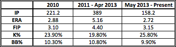 Of course, a lot of his inconsistencies have to do with his pitching mechanics. Doug Thorburn writes an excellent column for Baseball Prospectus called “Raising Aces”, where he looks at the mechanics of major league pitchers and pitching prospects. He’s looked at Jimenez several times and this article does a nice job of comparing Jimenez’s mechanics in 2010 (when he was fantastic) and 2012 (when he was not). Below are two videos of Jimenez, the first one from 2012, and the second from the second half of 2013. You can see just how complicated his delivery is, making it difficult for him to repeat it. And when pitchers have trouble repeating their delivery, they tend to lose their command, and poor command has been an issue that has troubled Jimenez throughout his career.