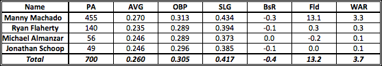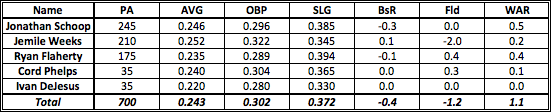 Orioles second baseman contributed 2.4 fWAR last year, putting them in a tie for 14th in baseball (actually better than I remember). Most of this production came from Ryan Flaherty, and most of THAT production came from Ryan Flaherty’s glove. I do think Zips is a little optimistic on the number of times Jemile Weeks will come to the plate, and I would bet some his PA’s will go to Flaherty. Obviously Zips hasn’t been updated to reflect the trade for Steve Lombardozzi, so these numbers will change, with the most likely outcome of Schoop’s plate appearances going to the new guy. The number of overall wins produced though probably won’t change all that much (Zips projects Lombardozzi to be worth 0.8 fWAR in 483 PA’s).