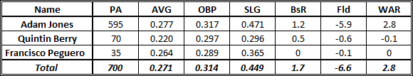 Orioles left fielders were essentially a middle of the pack group last year, producing 2.2 fWAR, placing them 16th in baseball. Nate McLouth (signed by the Nationals in the offseason) produced 2.5 of those wins, while a dubious cast of characters added some negative value when McLouth wasn’t in the lineup. Zips sees most of McLouth’s PA’s going to newcomer David Lough in 2014, who is a similar player, but with less on-base ability and more defensive value. Someone worth watching is Nolan Reimold. If he’s healthy (this is said EVERY year), he is a guy who could play and produce a lot more than Zips is currently projecting (although, I’m not exactly putting my faith in Reimold’s health).