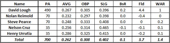 In 2013, Baltimore’s right fielders were abysmal (and by right fielders, I mean Nick Markakis). Markakis was the sole producer of the team’s -0.1 fWAR at the position, good (bad?) for 26th in all of baseball. It will be hard for Markakis to be worse in 2014, and I think that Zips is giving him a pretty good projection for the year, with a chance for a slight increase in batting average and power (in my opinion).
