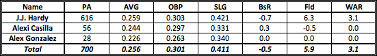 The Orioles produced 3.4 fWAR at SS in 2013, good for 8th best in baseball. All of that production was courtesy of J.J. Hardy. While Zips sees Hardy as having a slightly worse 2014 both offensively and defensively, it’s expecting him to have a very similar season (low OBP, good power, good defense). Trading Alex Gonzalez shouldn’t change this table, as you can either give his at-bats to Casilla or (more likely) Hardy. Because let’s face it, if he’s healthy, you should see Hardy manning the position every day.