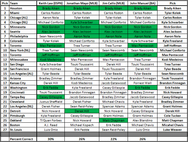 I gave Keith Law and John Manuel credit for both of their Toronto Blue Jays picks, as they each picked the correct players, but in the wrong order. Law picked the most correct draftees, however, all experts were fairly close to each other in the number of correct picks. No analysis here, just a fun little exercise. Hope everyone enjoyed the draft!