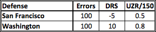 EDGE: Washington. Based on these statistics, the Nationals are the better defensive team, however, keep an eye on how much Ryan Zimmerman plays third base. Putting Zimmerman at third and Rendon at second gives the Nationals their best infield defense in terms of range, but Zimmerman can get erratic with his throws sometimes, which could help the Giants get a big inning and steal one of these games.