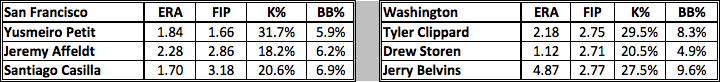 EDGE: Washington. Based on these 3 relievers, it would appear that they are pretty similar bullpens, but cutting off the list of the top 3 does the Nationals bullpen a grave disservice. Jerry Blevins has been worth 0.9 fWAR in 2014. But the list doesn’t stop there. Rafael Soriano (0.9 fWAR), Matt Thornton (0.7), Aaron Barrett (0.6), and Craig Stammen (0.6) are right behind him. Granted it’s unknown if Soriano will be used much due to his late season struggles, but the Nationals will also have Gonzalez or Roark joining the bullpen as well. The Giants don’t have a dominant starter heading to the bullpen (no, Tim Lincecum doesn’t count), and for reference, Petit (San Francisco’s best reliever) has produced the same amount of fWAR as Washington’s Blevins.