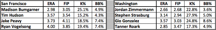 EDGE: Push. These teams are pretty comparable offensively, with the Giants holding a slight edge according to wRC+. But as I stated prior to the NL wild card game, the Giants are missing Angel Pagan and Mike Morse, so despite scoring 8 runs on Wednesday night, their offense isn’t quite at full strength. They started Travis Ishikawa in left field for crying out loud! With Bryce Harper hitting much better toward the end of the season and a (somewhat) healthy Ryan Zimmerman back in the lineup, I’d actually give the slight edge to Washington.