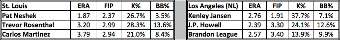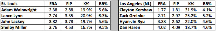 EDGE: Los Angeles. The Dodgers are clearly the better offensive team, and they tied the Angels for the best wRC+ in the majors this year. The extended loss of Yadier Molina, along with slow starts from Peter Bourjos and Kolten Wong hurt the Cardinals offense, so I wouldn’t be surprised if their offense performs better than their full season statistics show. Still, it will be a difficult task against the Dodgers starting pitchers.